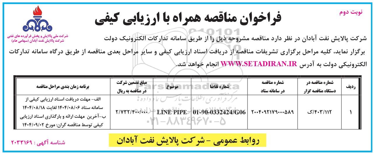 فراخوان مناقصه ارزیابی کیفی LINE PIPE / نوبت دوم, فراخوان مناقصه ارزیابی کیفی LINE PIPE / نوبت دوم