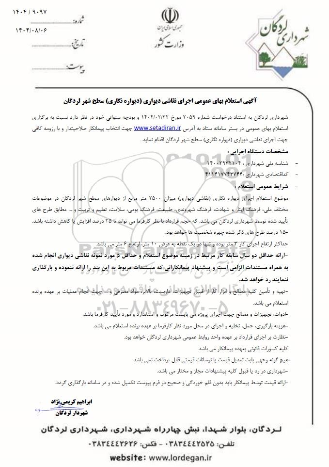 شهرداری لردگان به استناد درخواست شماره 2059 مورخ 1404.02.22 و بودجه سنواتی خود در نظر دارد نسبت به برگزاری استعلام بهای عمومی در بستر سامانه ستاد به آدرس سایت ستاد ایران جهت انتخاب پیمانکار صلاحیتدار و با رزومه کافی جهت اجرای نقاشی دیواری دیواره نگاری سطح شهر لردگان اقدام نماید.