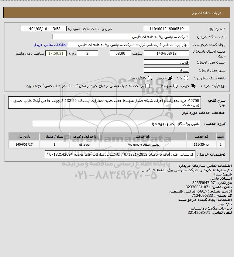 شرح کلی نیاز: 45750 خرید تجهیزات و اجرای شبکه فشار متوسط جهت تغذیه اضطراری ایستگاه 20 132 کیلوولت حاجی آباد2 داراب خسویه زرین دشت