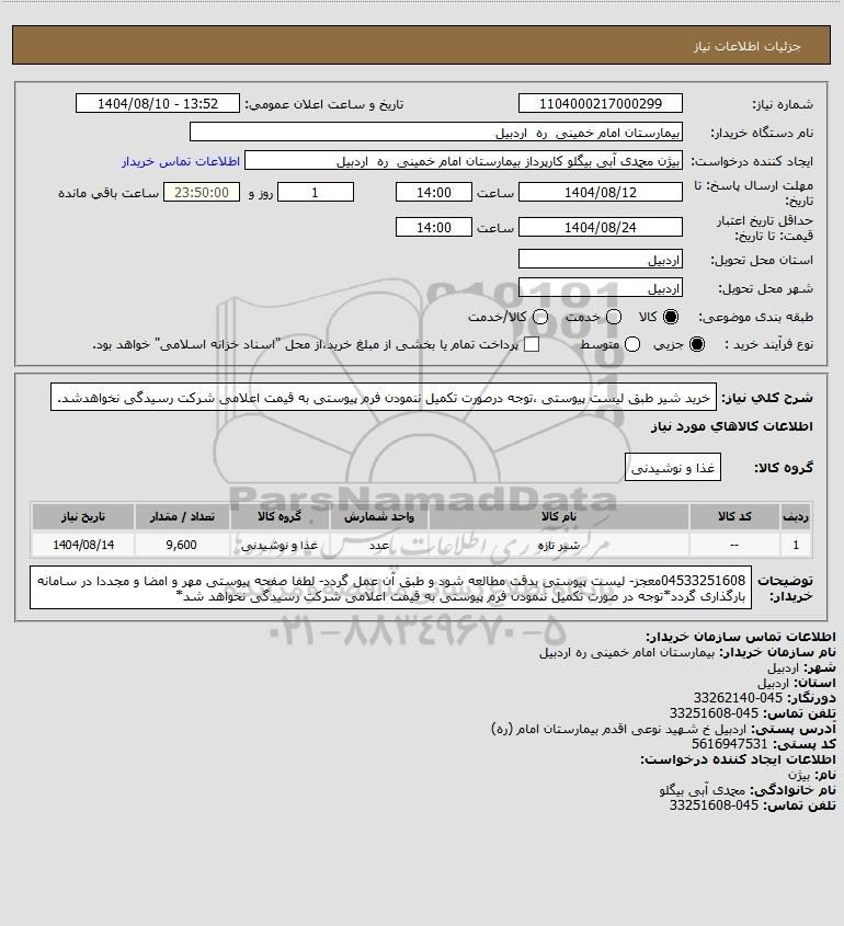 استعلام بها و موضوع استعلام استعلام خرید شیر طبق لیست پیوستی ،توجه درصورت تکمیل ننمودن فرم پیوستی به قیمت اعلامی شرکت رسیدگی نخواهدشد. به اطلاع کلیه شرکت‌ها و افراد متخصص واجد شرایط می‌رساند، آگهی گذار در نظر دارد از طریق استعلام بها، نسبت به انتخاب و دریافت پیشنهادات اقدام نماید. این استعلام با کد آگهی ثبت شده در سامانه خبرگزاری پارس نماد : 9781944 منتشر شده است. مشخصات استعلام : تاریخ شروع استعلام: 1404/08/10 آخرین مهلت ارسال پیشنهاد قیمت : 1404/08/12 و محل اجرای پروژه : استان اردبیل میباشد. استعلام قیمت مورد درخواست : استعلام خرید شیر طبق لیست پیوستی ،توجه درصورت تکمیل ننمودن فرم پیوستی به قیمت اعلامی شرکت رسیدگی نخواهدشد. با دسته‌بندی‌های تخصصی و گروه های مرتبط : مواد غذایی, استعلام اطلاع رسانی میگردد.