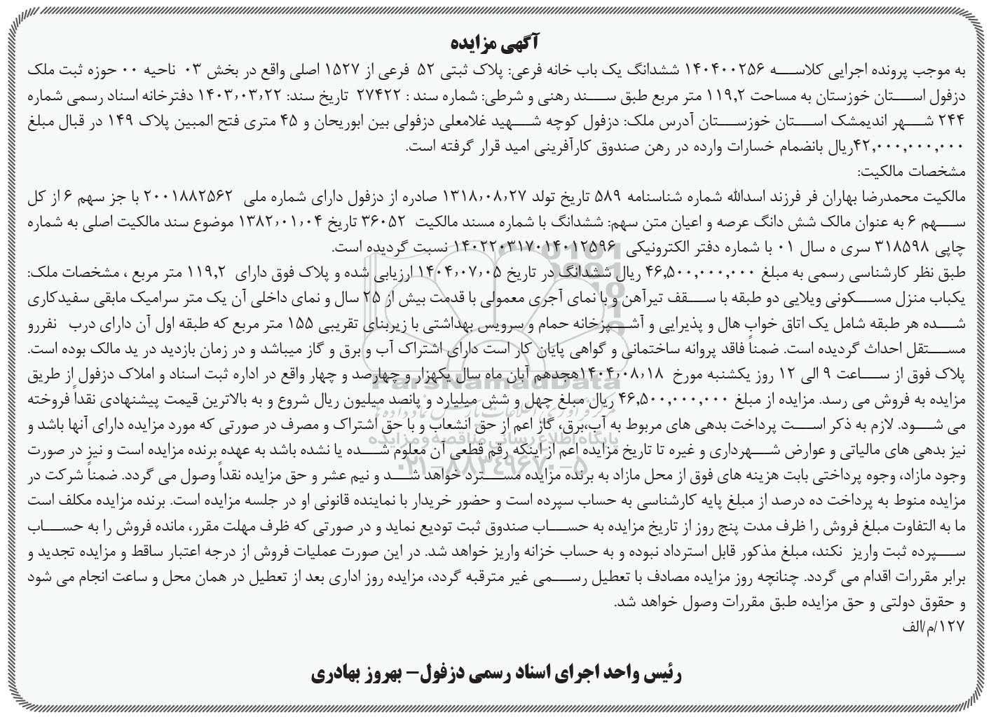 يلاك فوق از ساعت 9 الي 12 روز یکشنبه مورخ 1404.08.18 هجدهم آبان ماه سال یکهزار و چهارصد و چهار واقع در اداره ثبت اسناد و املاک دزفول از طریق مزایده به فروش می رسد. مزایده از مبلغ 46.500.000.000 ريال مبلغ چهل و شش میلیارد و پانصد میلیون ریال شروع و به بالاترین قیمت پیشنهادی نقدا فروخته میشود. لازم به ذکر است پرداخت بدهي هاي مربوط به آب برق گاز اعم از حق انشعاب و یا حق اشتراك و مصرف در صورتی که مورد مزایده داراي آنها باشد و نیز بدهي هاي مالياتي و عوارض شهرداری و غیره تا تاریخ مزایده اعم از اینکه رقم قطعی آن معلوم شده یا نشده باشد به عهده برنده مزایده است و نیز در صورت وجود مازاد وجوه پرداختی بابت هزينه هاي فوق از محل مازاد به برنده مزایده مسترد خواهد شد و نیم عشر و حق مزايده نقداً وصول می گردد. ضمناً شرکت در مزایده منوط به پرداخت ده درصد از مبلغ پایه کارشناسی به حساب سپرده ثبت و حضور خریدار یا نماینده قانونی او در جلسه مزایده است. برنده مزایده مکلف است ما به التفاوت مبلغ فروش را ظرف مدت پنج روز از تاریخ مزایده به حساب صندوق ثبت تودیع نماید و در صورتی که ظرف مهلت مقرر مانده فروش را به حساب سپرده ثبت واریز نکند مبلغ مذکور قابل استرداد نبوده و به حساب خزانه واریز خواهد شد. در این صورت عملیات فروش از درجه اعتبار ساقط و مزایده تجدید و برابر مقررات اقدام میگردد. چنانچه روز مزایده مصادف با تعطیل رسمی غیر مترقبه ،گردد مزایده روز اداري بعد از تعطیل در همان محل و ساعت انجام می شود و حقوق دولتي و حق مزایده طبق مقررات وصول خواهد شد.