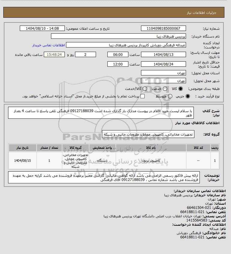 | 1 | -- | کامپیوتر بربون | دستگاه | تجهیزات مخابراتی، کامپیوتر، موبایل، ملزومات جانبی و شبکه | 1 | 1404/08/15 |
