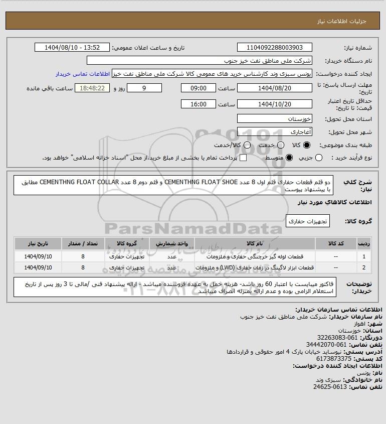 شرح کلی نیاز: دو قلم قطعات حفاری قلم اول 8 عدد CEMENTHNG FLOAT SHOE و قلم دوم 8 عدد CEMENTHNG FLOAT COLLAR مطابق با پیشنهاد پیوست