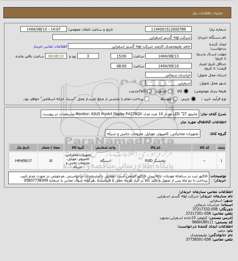 شرح کلی نیاز: مانیتور 27" LED تعداد 10 عدد مدل Monitor: ASUS ProArt Display PA278QV مشخصات در پیوست