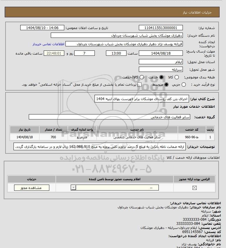شرح کلی نیاز: اجرای بتن کف روستای موشکان برابر فهرست بهای ابنیه 1404