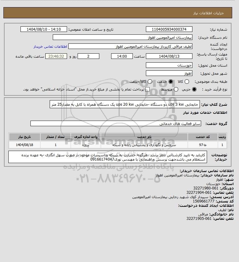 شرح کلی نیاز: جابجایی ups 3 kw دو دستگاه -جابجایی ups 20 kw یک دستگاه همراه با کابل به مقدار25 متر