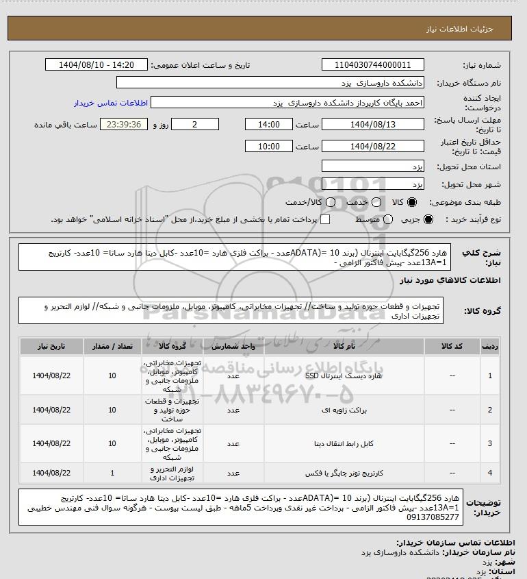 | 1 | -- | هارد دیسک اینترنال SSD | عدد | تجهیزات مخابراتی، کامپیوتر، موبایل، ملزومات جانبی و شبکه | 10 | 1404/08/22 |