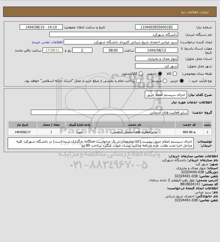 توضیحات خریدار:اجرای سیستم اعلام حریق پیوست (کالا وملزومات در یک درخواست جداگانه بارگذاری شده است) در دانشگاه شهرکرد کلیه مراحل اجرا تحت نظارت طرح وبرنامه وباتایید ایشان صورت میگیرد پرداخت 50 روز