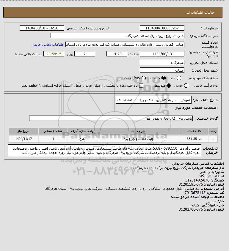 استعلام تعویض سیم به کابل روستای چراغ آباد هشتبندی, استعلام تعویض سیم به کابل روستای چراغ آباد هشتبندی