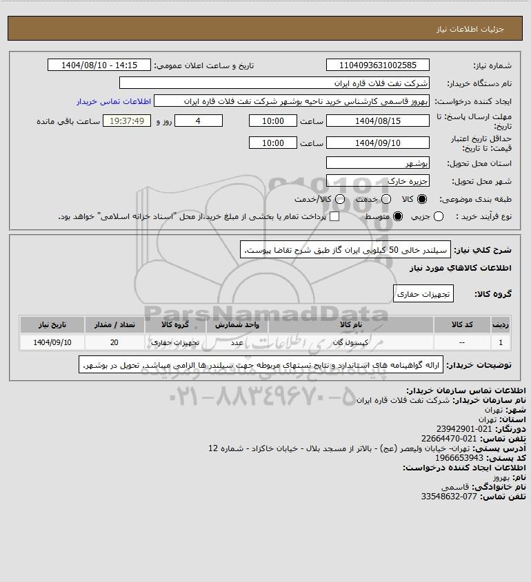 شرح کلی نیاز: سیلندر خالی 50 کیلویی ایران گاز طبق شرح تقاضا پیوست.