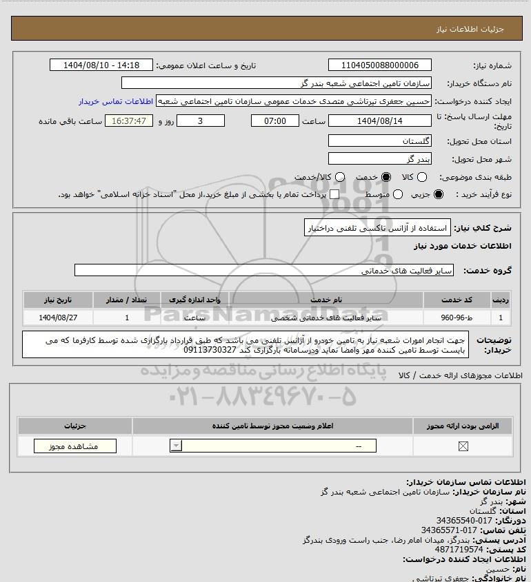 توضیحات خریدار:جهت انجام امورات شعبه نیاز به تامین خودرو از آژانس تلفنی می باشد که طبق قرارداد بارگزاری شده توسط کارفرما که می بایست توسط تامین کننده مهر وامضا نماید ودرسامانه بارگزاری کند 09113730327