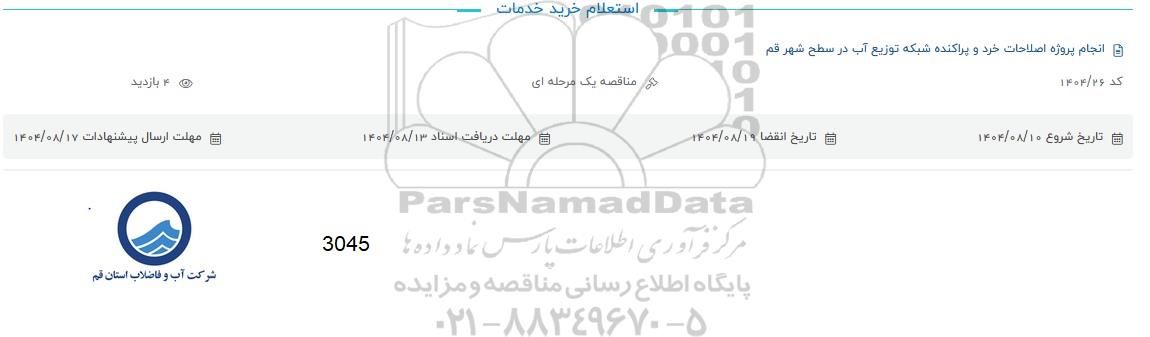 استعلام بها و موضوع استعلام استعلام انجام پروژه اصلاحات خرد و پراکنده شبکه توزیع آب در سطح شهر قم به اطلاع کلیه شرکتها و افراد متخصص واجد شرایط میرساند، آگهی گذار در نظر دارد از طریق استعلام بها، نسبت به انتخاب و دریافت پیشنهادات اقدام نماید. این استعلام با کد آگهی ثبت شده در سامانه خبرگزاری پارس نماد : 9782082 منتشر شده است. مشخصات استعلام : تاریخ شروع استعلام: 1404/08/10 آخرین مهلت ارسال پیشنهاد قیمت : 1404/08/13 و محل اجرای پروژه : استان قم میباشد. استعلام قیمت مورد درخواست : استعلام انجام پروژه اصلاحات خرد و پراکنده شبکه توزیع آب در سطح شهر قم با دستهبندیهای تخصصی و گروه های مرتبط : پیمانکاری آب و فاضلاب, استعلام اطلاع رسانی میگردد.