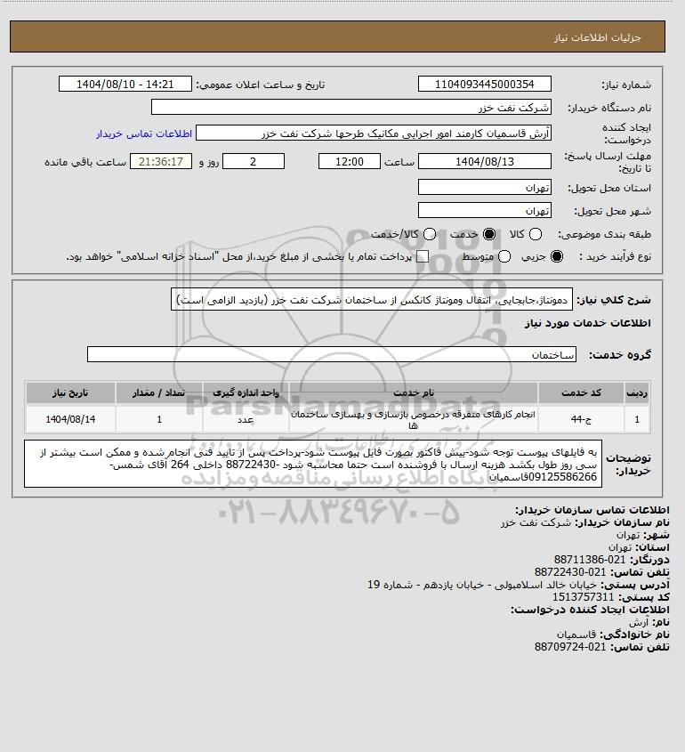 شرح کلی نیاز: دمونتاژ،جابجایی، انتقال ومونتاژ کانکس از ساختمان شرکت نفت خزر (بازدید الزامی است)