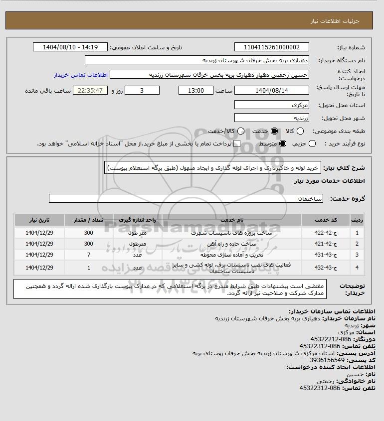 شرح کلی نیاز: خرید لوله و خاکبرداری و اجرای لوله گذاری و ایجاد منهول (طبق برگه استعلام پیوست)