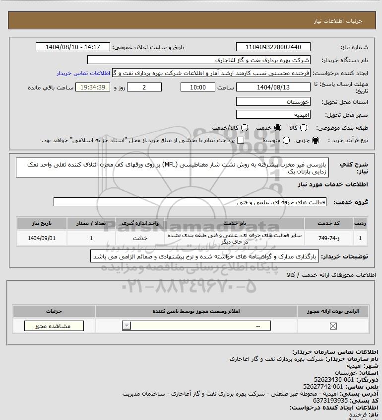 استعلام بازرسی غیر مخرب پیشرفته به روش نشت شار مغناطیسی (MFL) بر روی ورقهای کف مخزن ائتلاف کننده ثقلی واحد نمک زدایی پازنان یک, استعلام بازرسی غیر مخرب پیشرفته به روش نشت شار مغناطیسی (MFL) بر روی ورقهای کف مخزن ائتلاف کننده ثقلی واحد نمک زدایی پازنان یک