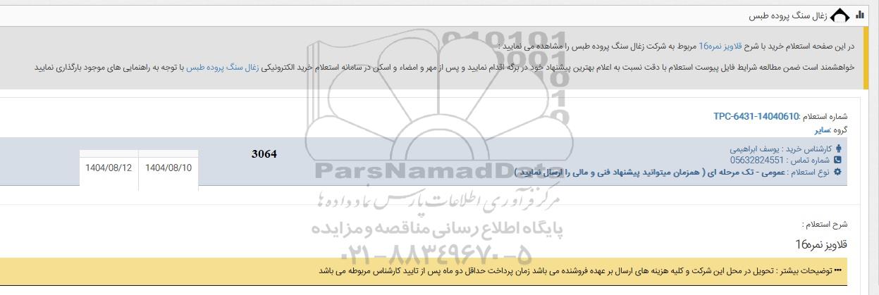 در این صفحه استعلام خرید با شرح قلاویز نمره 16 مربوط به شرکت سنگ پروده طبس را مشاهده می نمایید :