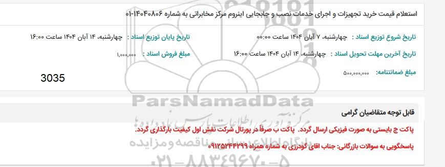 استعلام قیمت خرید تجهیزات و اجرای خدمات نصب و جابجایی اینروم مرکز مخابراتی به شماره 14040806-01