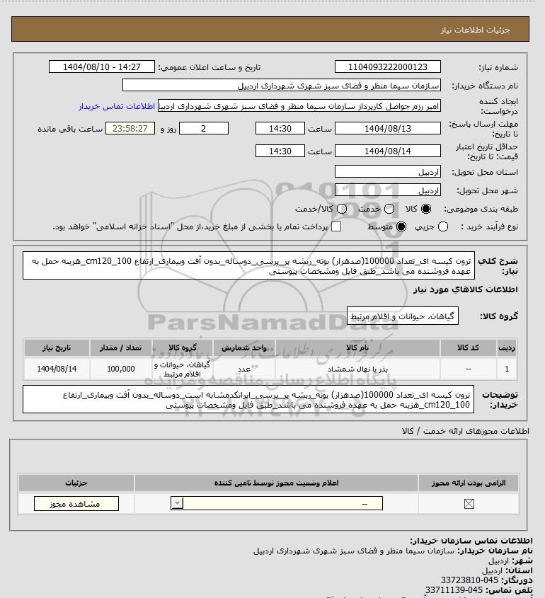شرح کلی نیاز: ترون کیسه ای_تعداد 100000(صدهزار) بوته_ریشه پر_پرسی_دوساله_بدون آفت وبیماری_ارتفاع 100_cm120_هزینه حمل به عهده فروشنده می باشد_طبق فایل ومشخصات پیوستی