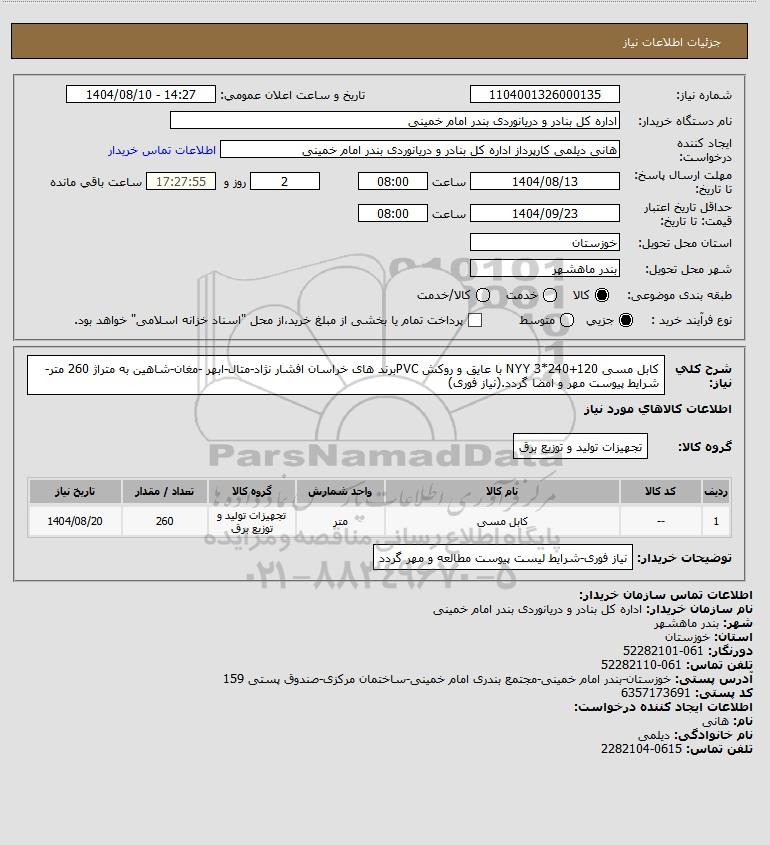 شرح کلی نیاز: کابل مسی 120+240*3 NYY با عایق و روکش PVCبرند های خراسان افشار نژاد-متال-ابهر -مغان-شاهین به متراژ 260 متر-شرایط پیوست مهر و امضا گردد.(نیاز فوری)