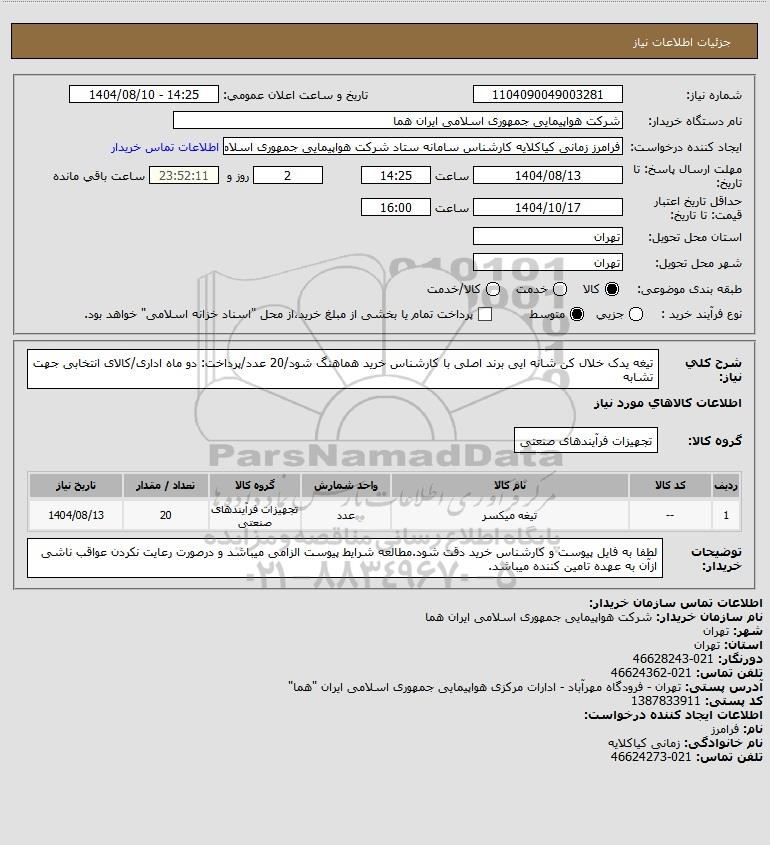 نام دستگاه خریدار:شرکت هواپیمایی جمهوری اسلامی ایران هما