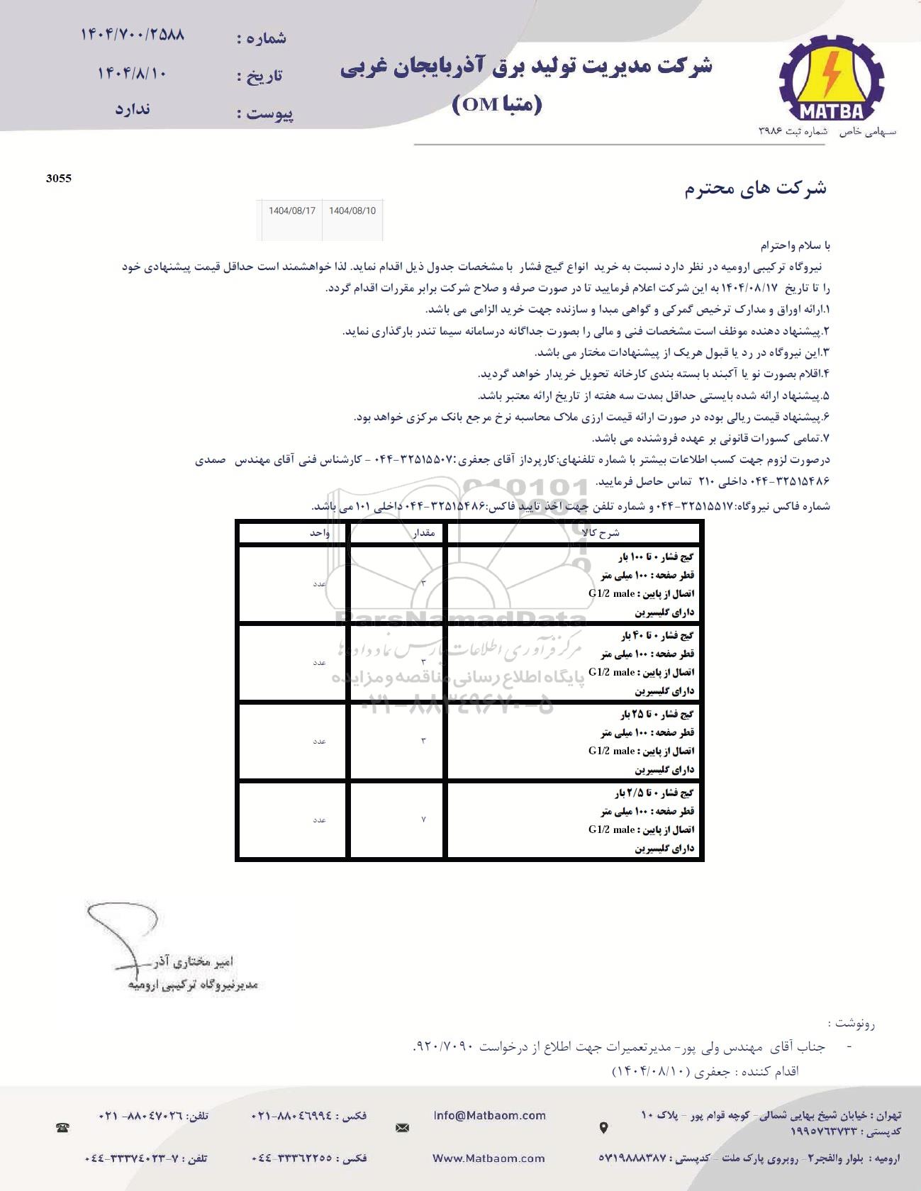 نیروگاه ترکیبی ارومیه در نظر دارد نسبت به خرید انواع گیج فشار با مشخصات جدول ذیل اقدام نماید. لذا خواهشمند است حداقل قیمت پیشنهادی خود را تا تاریخ 1404.08.17 به این شرکت اعلام فرمایید تا در صورت صرفه و صلاح شرکت برابر مقررات اقدام گردد.