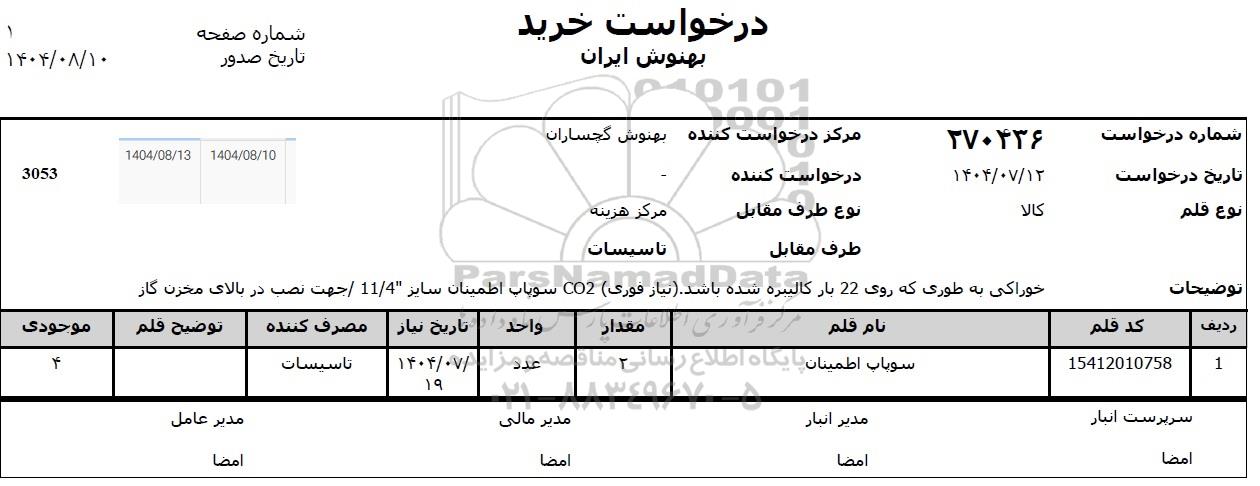 استعلام خرید سوپاپ اطمینان, استعلام خرید سوپاپ اطمینان