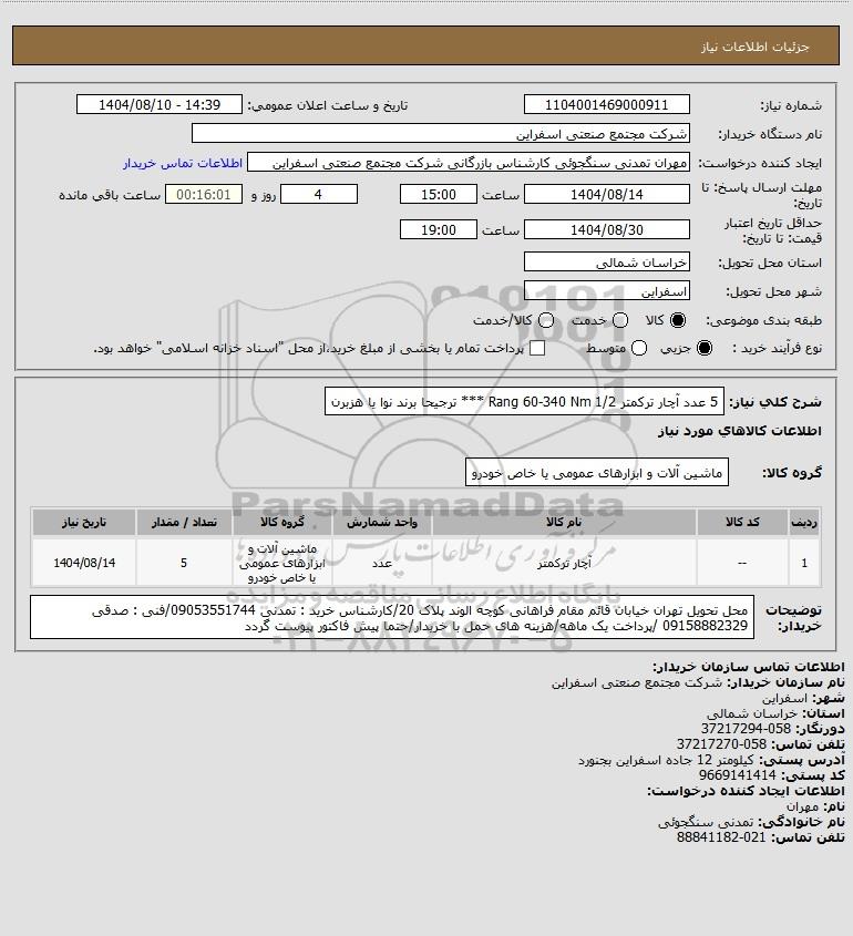 شرح کلی نیاز: 5 عدد آچار ترکمتر 1/2 Rang 60-340 Nm *** ترجیحا برند نوا یا هزبرن