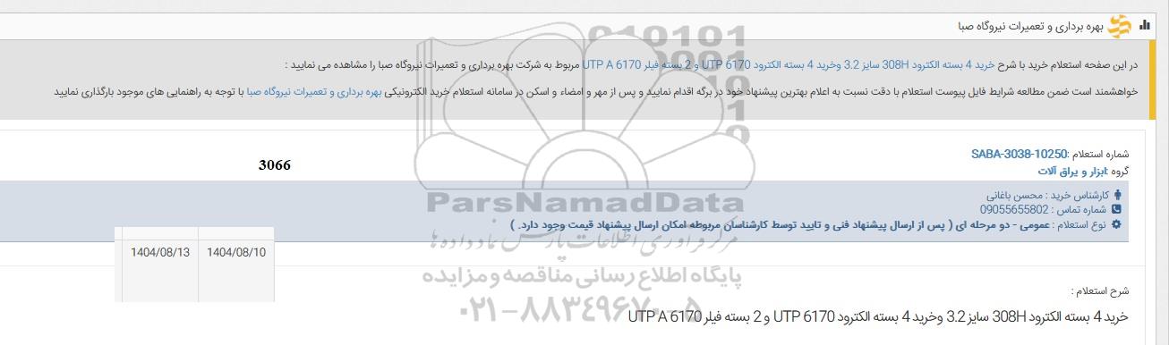در این صفحه استعلام خرید با شرح خرید 4 بسته الکترود 308H سایز 3.2 و خرید 4 بسته الکترود UTP 6170 و 2 بسته فیلر UTP A 6170 مربوط به شرکت بهره برداری و تعمیرات نیروگاه صبا را مشاهده می نمایید :