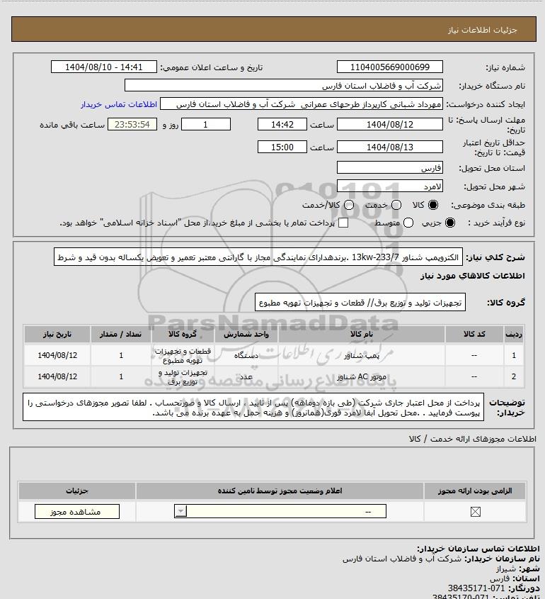 | 2 | -- | موتور AC شناور | عدد | تجهیزات تولید و توزیع برق | 1 | 1404/08/12 |