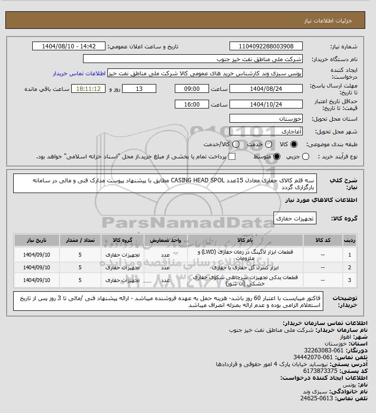 شرح کلی نیاز: سه قلم کالای حفاری معادل 15عدد CASING HEAD SPOL مطابق با پیشنهاد پیوست مدارک فنی و مالی در سامانه بارگزاری گردد