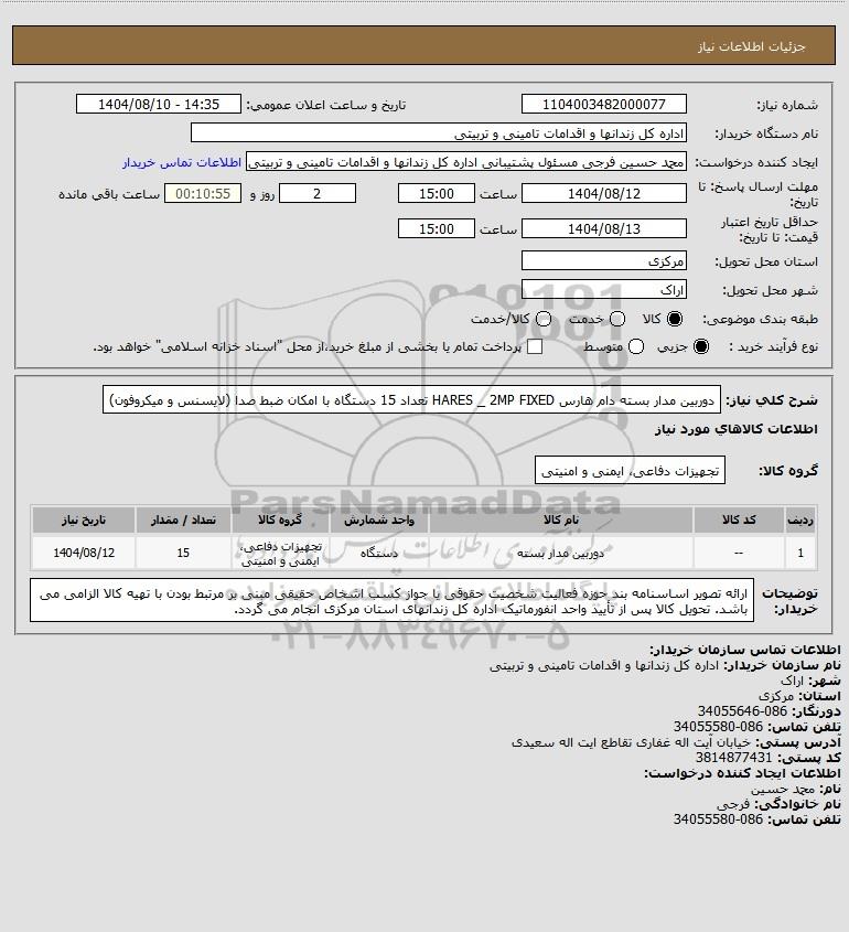 استعلام دوربین مدار بسته دام هارس HARES _ 2MP FIXED تعداد 15 دستگاه با امکان ضبط صدا (لایسنس و میکروفون), استعلام دوربین مدار بسته دام هارس HARES _ 2MP FIXED تعداد 15 دستگاه با امکان ضبط صدا (لایسنس و میکروفون)