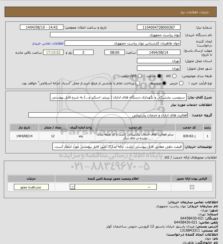 شرح کلی نیاز: سرویس، پشتیبانی و نگهداری دستگاه های اداری ( پرینتر، اسکنر و...) به شرح فایل پیوستی