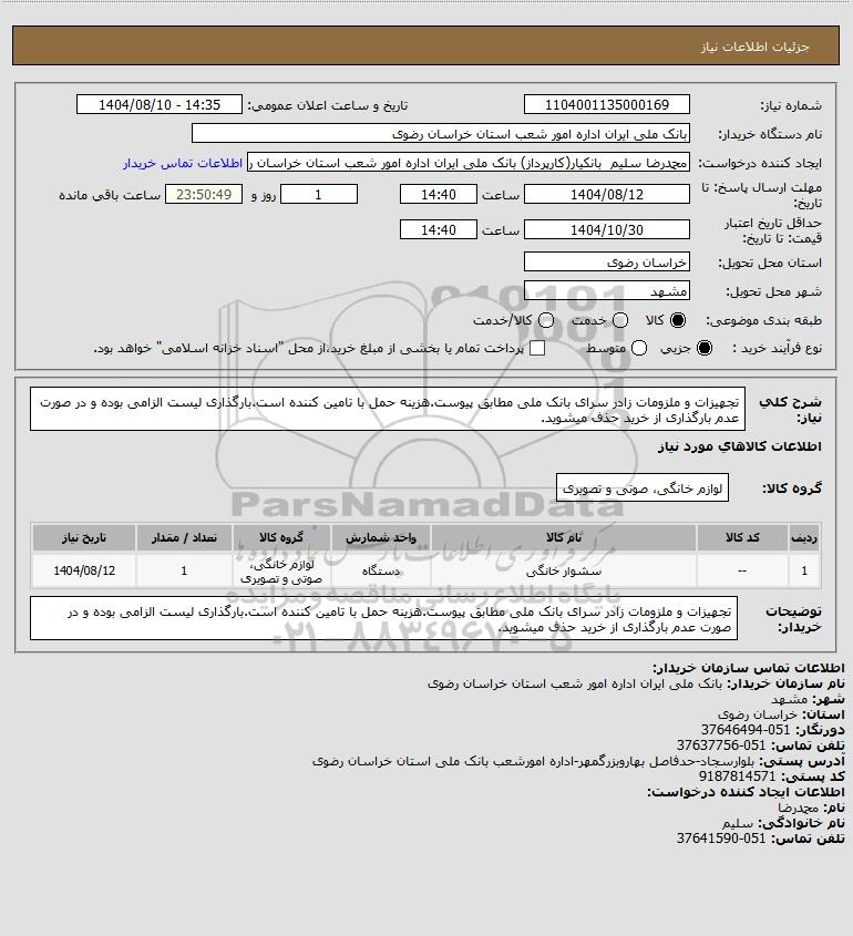 توضیحات خریدار:تجهیزات و ملزومات زادر سرای بانک ملی مطابق پیوست.هزینه حمل با تامین کننده است.بارگذاری لیست الزامی بوده و در صورت عدم بارگذاری از خرید حذف میشوید.