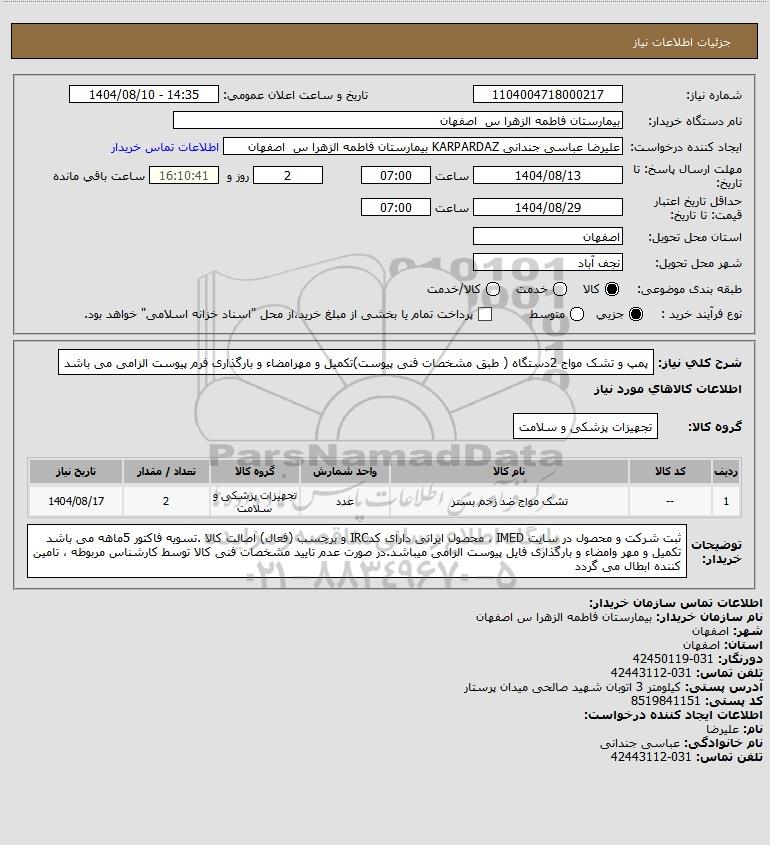شرح کلی نیاز: پمپ و تشک مواج 2دستگاه ( طبق مشخصات فنی پیوست)تکمیل و مهرامضاء و بارگذاری فرم پیوست الزامی می باشد