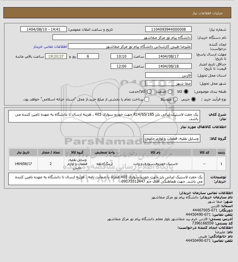 شرح کلی نیاز: یک جفت لاستیک ایرانی بارز 65/185/R14 جهت خودرو سواری 405 . هزینه ارسال تا دانشگاه به عهده تامین کننده می باشد.