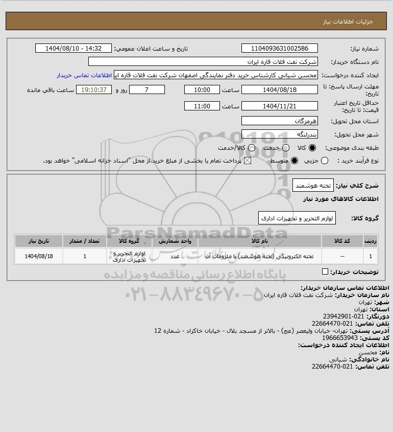 | 1 | -- | تخته الکترونیکی (تخته هوشمند) یا ملزومات آن | عدد | لوازم التحریر و تجهیزات اداری | 1 | 1404/08/18 |