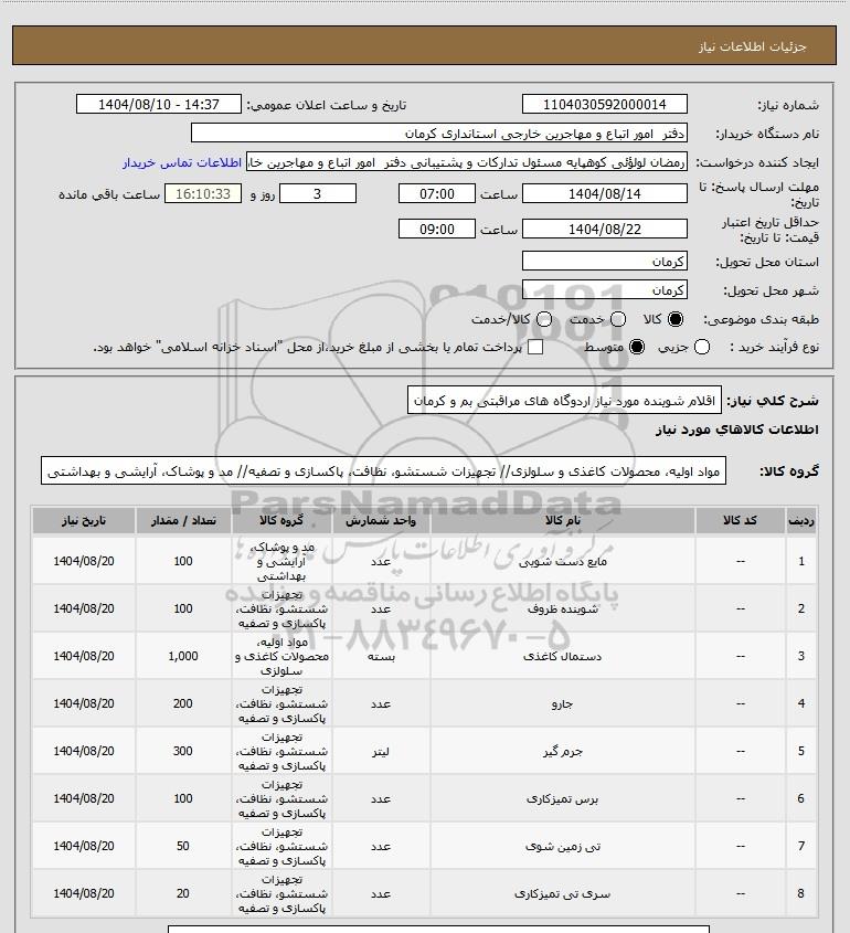 شرح کلی نیاز: اقلام شوینده مورد نیاز اردوگاه های مراقبتی بم و کرمان
