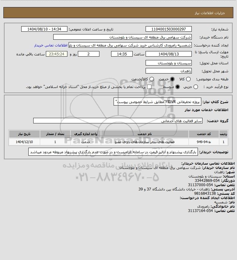 شرح کلی نیاز: پروژه تحقیقاتی FIDVR"مطابق شرایط خصوصی پیوست"