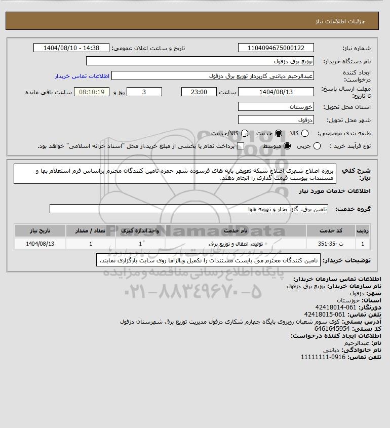 شرح کلی نیاز: پروژه اصلاح شهری-اصلاح شبکه-تعویض پایه های فرسوده شهر حمزه