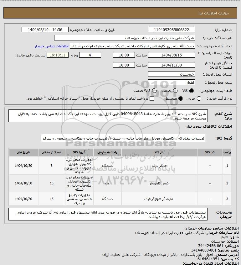 شرح کلی نیاز: شرح کالا سیستم کامپیوتر شماره تقاضا 0409648043 طبق فایل پیوست . توجه: ایران کد مشابه می باشد حتما به فایل پیوست مراجعه شود.