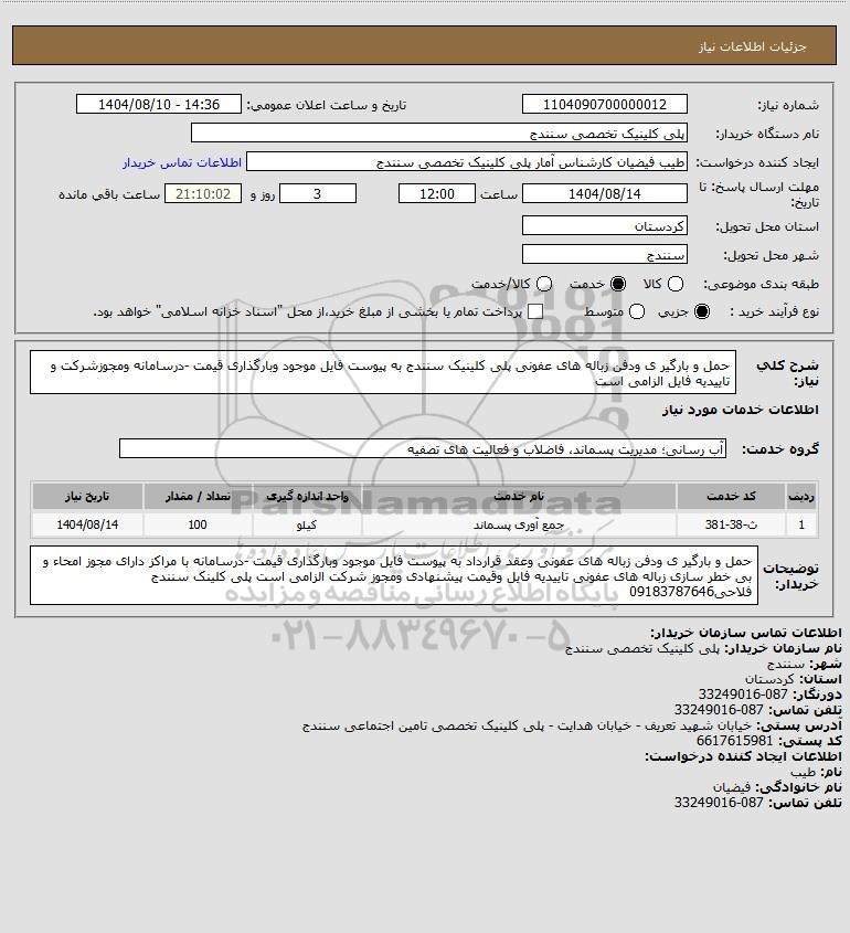 شرح کلی نیاز: حمل و بارگیر ی ودفن زباله های عفونی پلی کلینیک سنندج به پیوست فایل موجود وبارگذاری قیمت -درسامانه ومجوزشرکت و تاییدیه فایل الزامی است