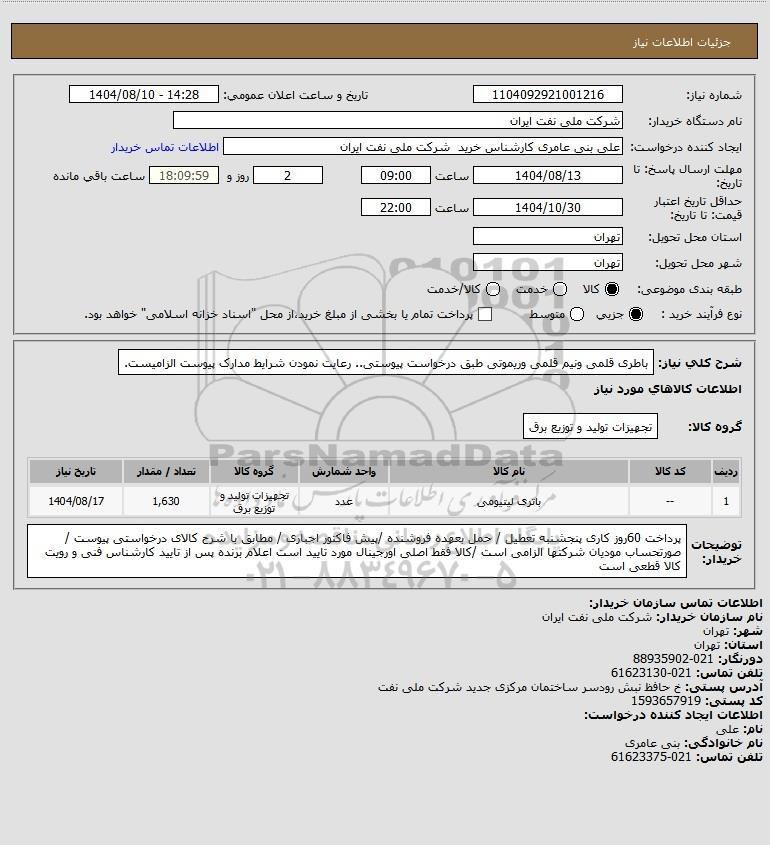 | 1 | -- | باتری لیتیومی | عدد | تجهیزات تولید و توزیع برق | 1,630 | 1404/08/17 |