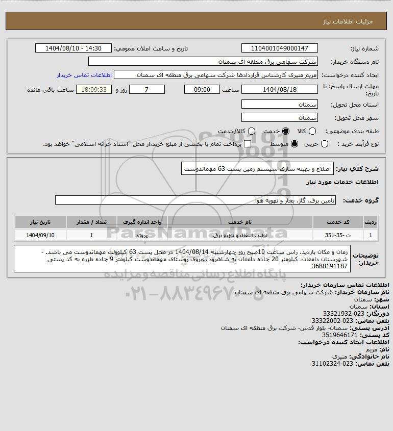 شرح کلی نیاز: اصلاح و بهینه سازی سیستم زمین پست 63 مهماندوست