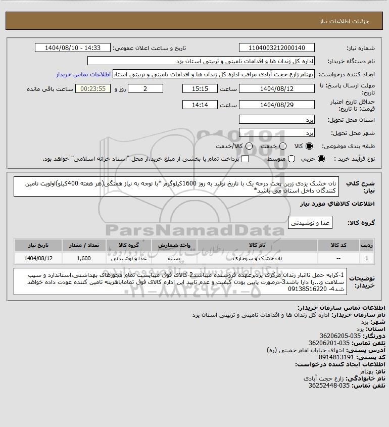 شرح کلی نیاز: نان خشک یزدی زرین پخت درجه یک با تاریخ تولید به روز 1600کیلوگرم