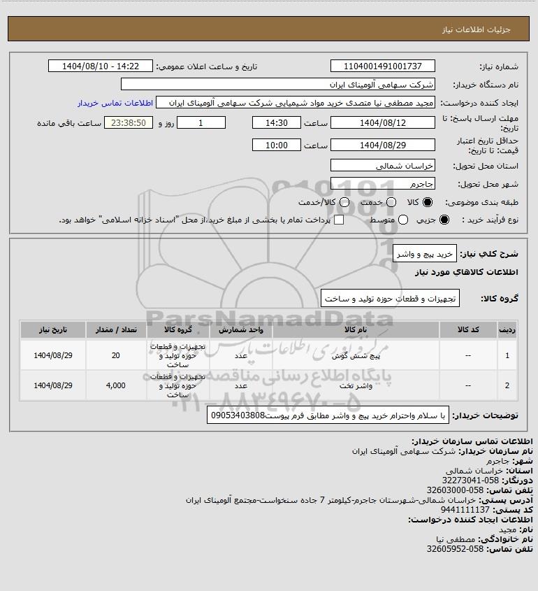 شرح کلی نیاز: خرید پیچ و واشر