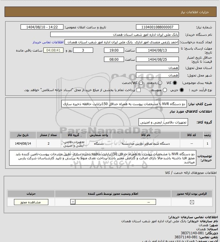 شرح کلی نیاز: دو دستگاه NVR با مشخصات پیوست به همراه حداقل 150ترابایت حافظه ذخیره سازی