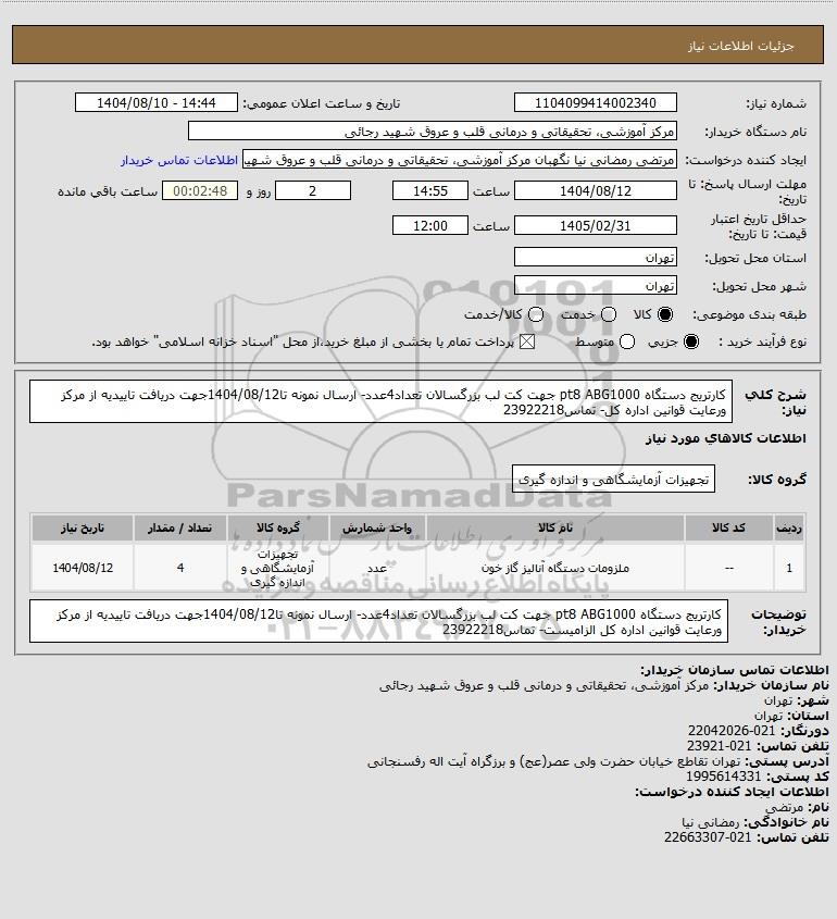 شرح کلی نیاز: کارتریج دستگاه pt8 ABG1000 جهت کت لب بزرگسالان تعداد4عدد- ارسال نمونه تا1404/08/12جهت دریافت تاییدیه از مرکز ورعایت قوانین اداره کل- تماس23922218