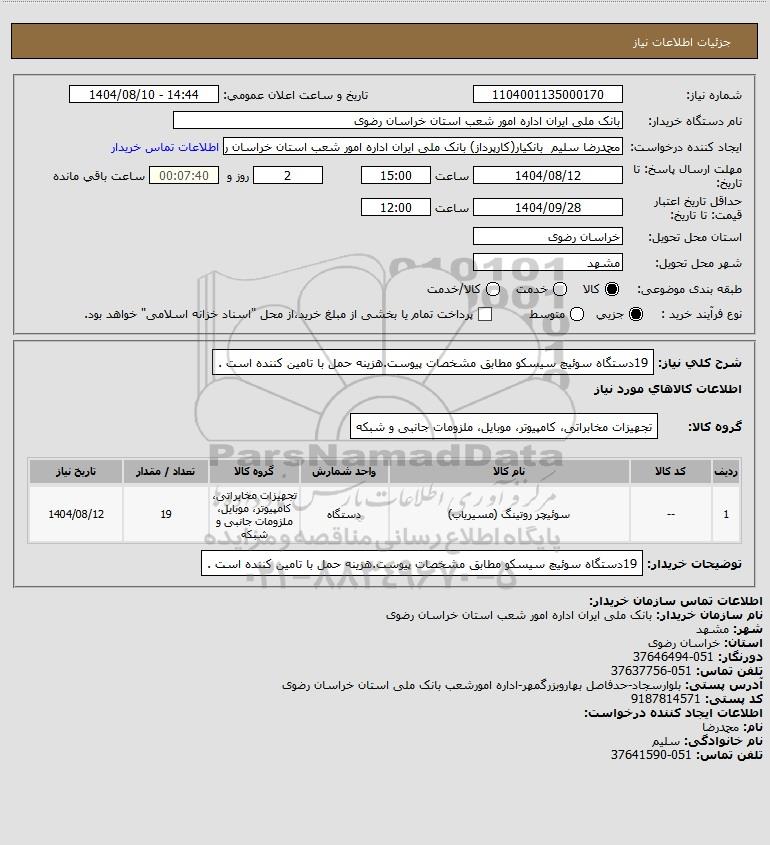 استعلام 19دستگاه سوئیچ سیسکو مطابق مشخصات پیوست.هزینه حمل با تامین کننده است ., استعلام 19دستگاه سوئیچ سیسکو مطابق مشخصات پیوست.هزینه حمل با تامین کننده است .