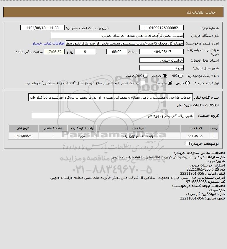 شرح کلی نیاز: خدمات طراحی و مهندسی، تامین مصالح و تجهیزات، نصب و راه اندازی تجهیزات نیروگاه خورشیدی 50 کیلو وات