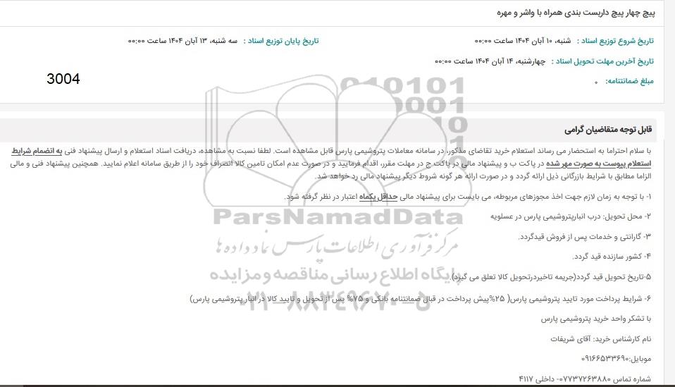 در صورت نیاز به دریافت راهنمایی یا پشتیبانی در خصوص استعلام و مناقصه و فراخوان مناقصه عمومی، مناقصه محدود، مناقصه بین‌ المللی، مناقصه دولتی، مناقصه خصوصی، مناقصه آنلاین فروش تجهیزات، مناقصه مشاوره‌ای مناقصه پتروشیمی و انرژی مناقصه صنایع و تجهیزات برق و مخابرات و نفت و گاز ... لطفاً با سایت خبری مناقصه و مزایده پارس‌نماد داده‌ها به شماره 88349670 تماس حاصل فرمایید.